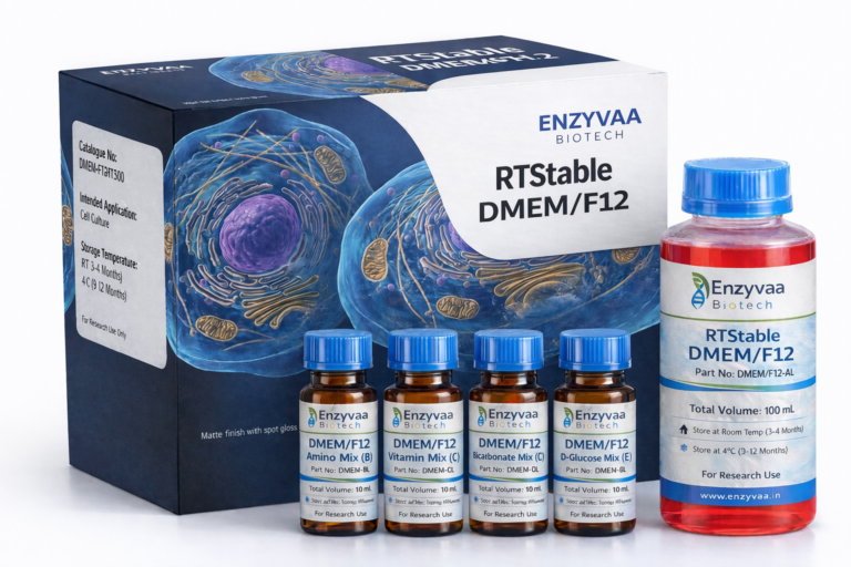 RTStable DMEM/F-12 is engineered for room-temperature storage while maintaining robust cell proliferation and achieving maximum cell densities comparable to those obtained with conventional DMEM/F-12 when supplemented with ≥10% fetal bovine serum (FBS).