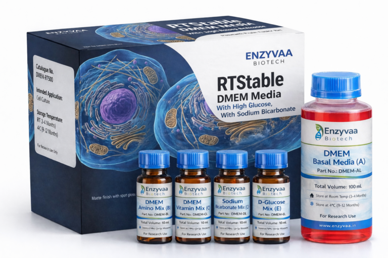 DMEM employs a sodium bicarbonate buffering system (3.7 g/L) and therefore requires a 5–10% CO₂ atmosphere to maintain physiological pH. The inclusion of RTStable glutamine minimizes toxic ammonia accumulation, thereby enhancing cell viability and supporting robust cell growth in a convenient, ready-to-use format. RTStable DMEM is protein-, lipid-, and growth factor-free and must be supplemented with ≥10% fetal bovine serum (FBS) prior to use.